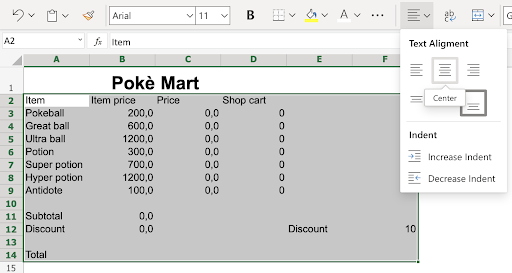 A2:F14 - Click the Align button in the Ribbon