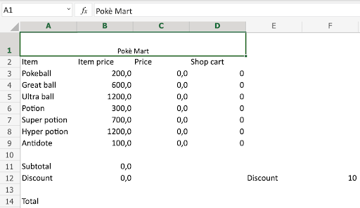 Type Poke Mart in the merged range A1:D1