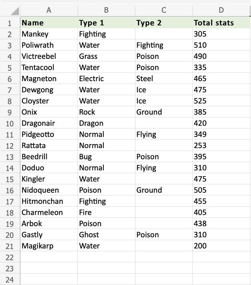 Apply the =COUNTA function to range A2:A21, counting Pokemons by their names, which are letters only: