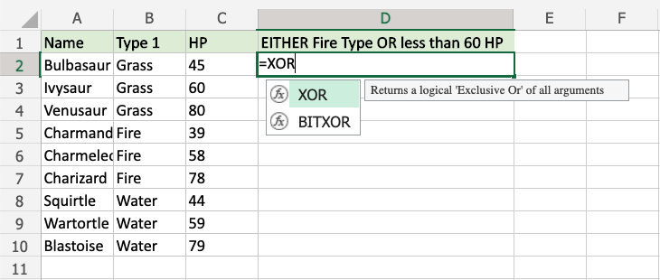 Now, each row has a check for Fire Type or HP less than 60, but not both: