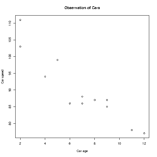 of Cars", xlab="Car age", ylab="Car speed")